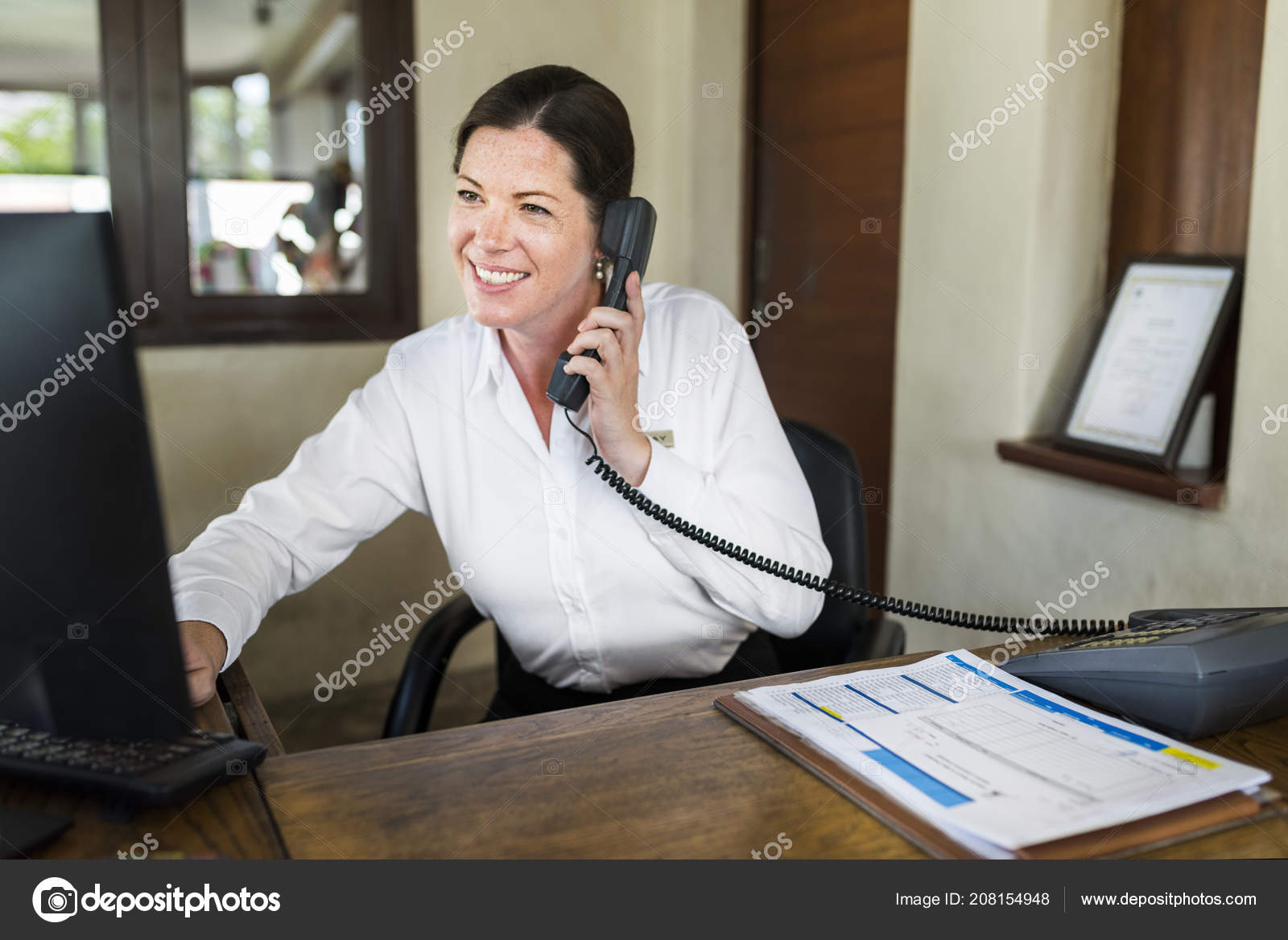 Cheerful front desk executive attending.